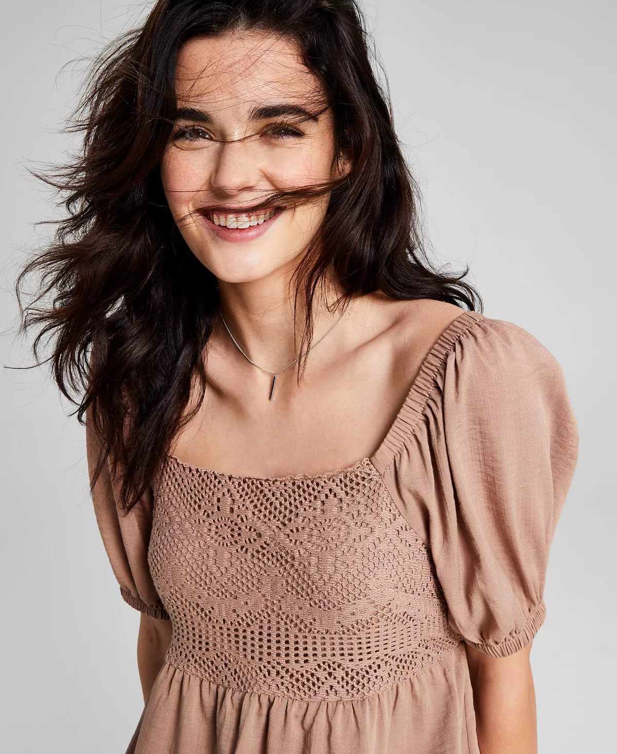 Romantic puff sleeves frame this women’s dress from And Now This, finished with a crochet design at the top for stylish interest.