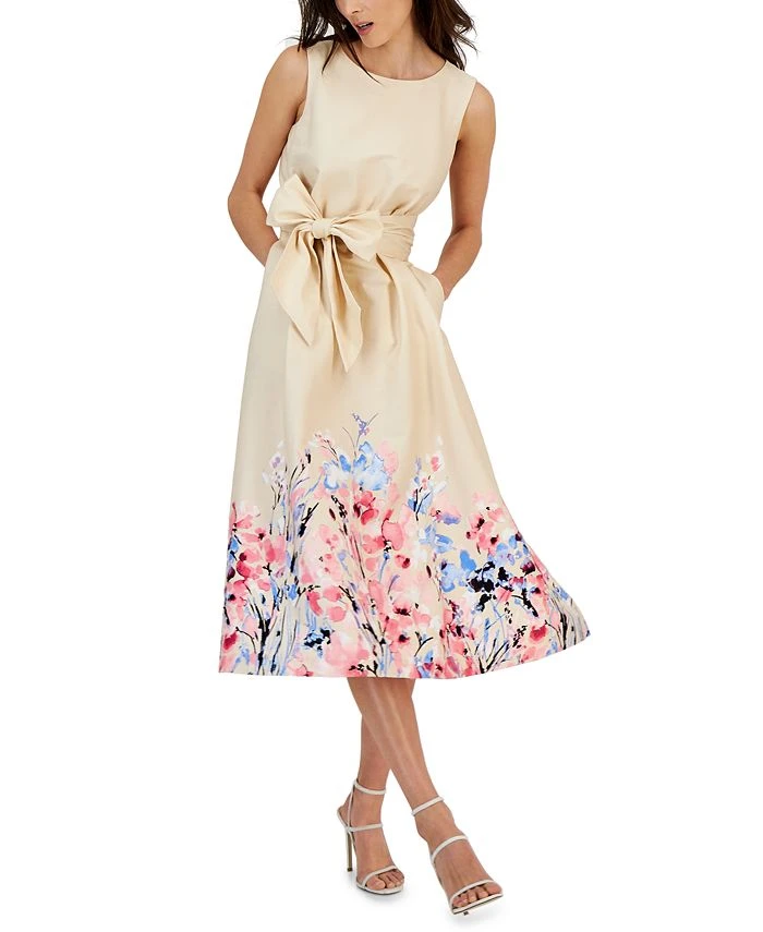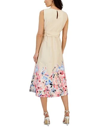 A floral-print hem and bold sash detail at the waist team up to perfection in this fit & flare dress from Anne Klein.