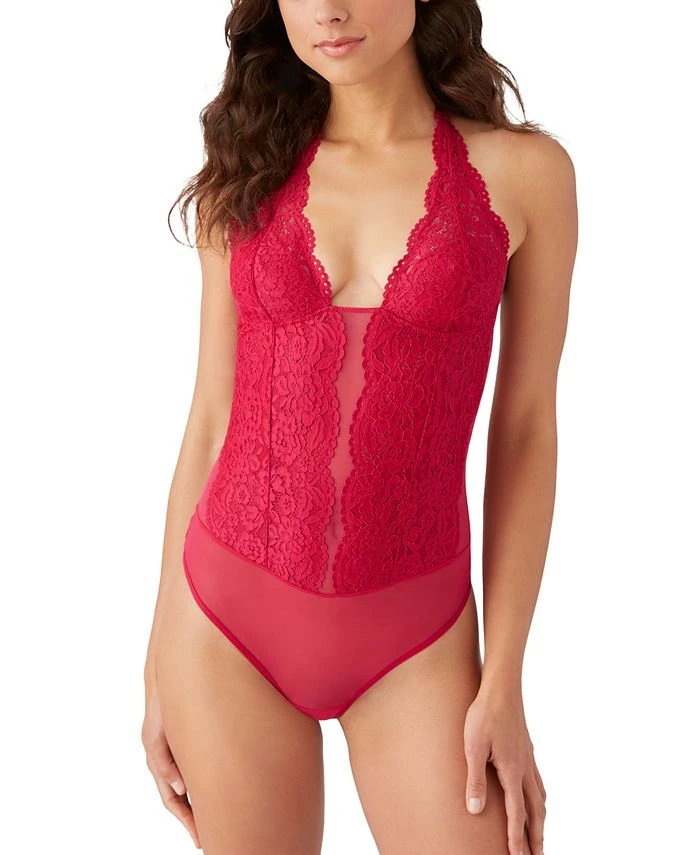Scalloped lace edging peeks out in flirty fashion when you wear this alluring Ciao bella lace halter bodysuit by b.tempt’d.