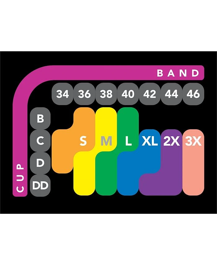 - Sizing Conversion: S: 34B-C, 36C-D M: 36D-DD, 38B-C, L: 40B-C, 38D-DD, XL: 42C-D, 40D-DD, 2X: 44C-DD, 42DD, 3X: 46C-DD