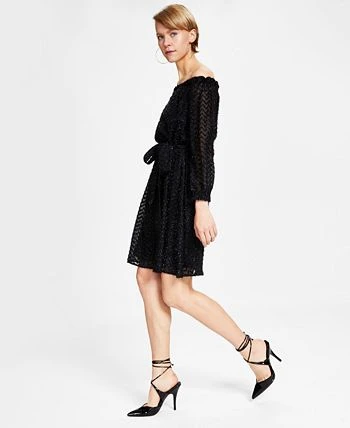 Swirls of sparkly eyelash detail lend endless drama and depth to this chic off-the-shoulder dress from Bar III. A smocked waistline completes the look.
