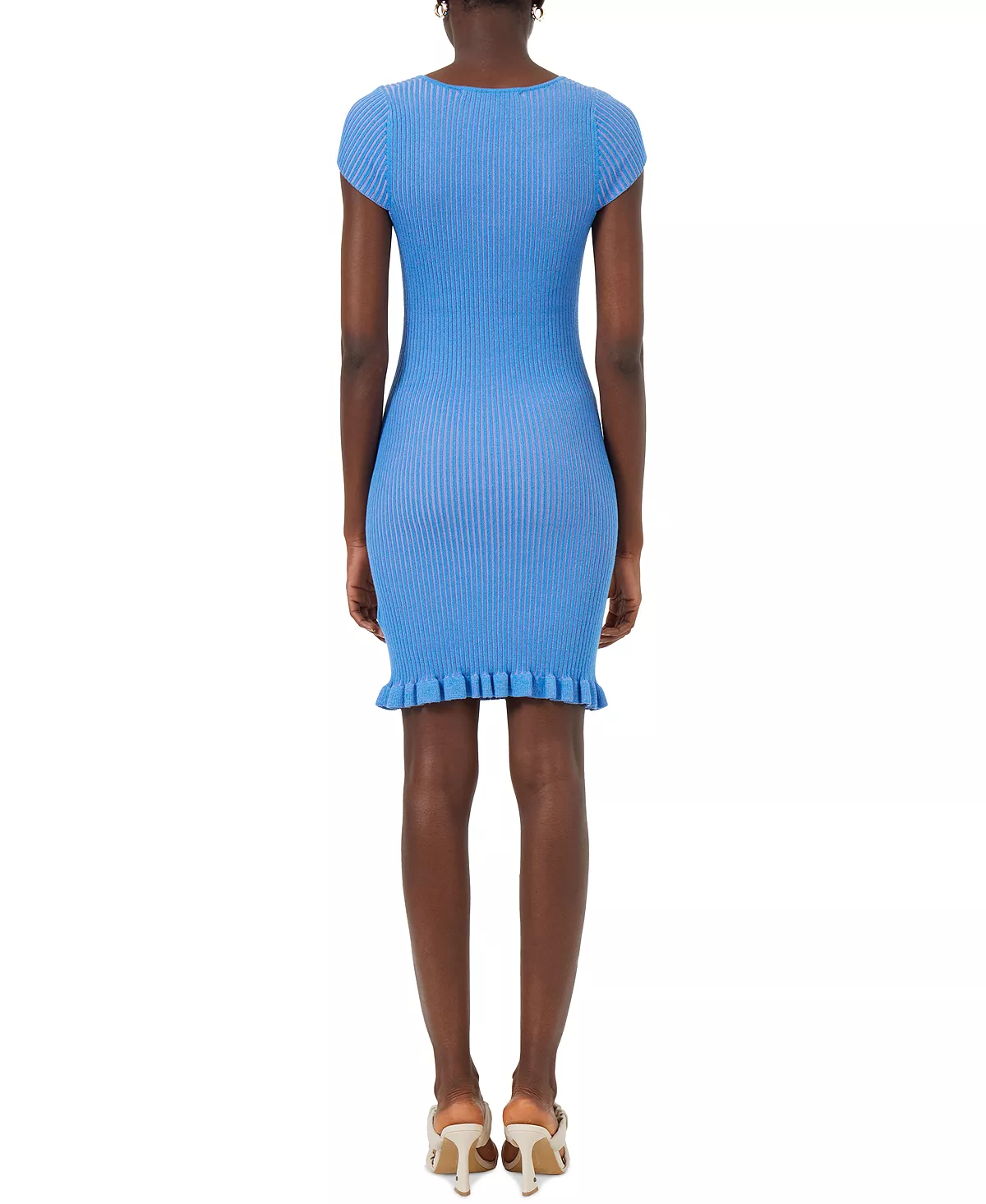A sleek ribbed knit defines this curve-hugging bodycon dress from French Connection, a modern mini silhouette finished with chic cap sleeves and a romantic ruffled hem.