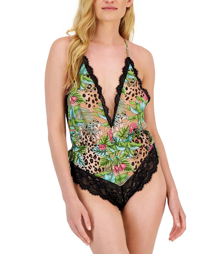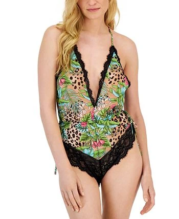Chiffon printed bodysuit with lace detail from Inc International Concepts, with adjustable straps.