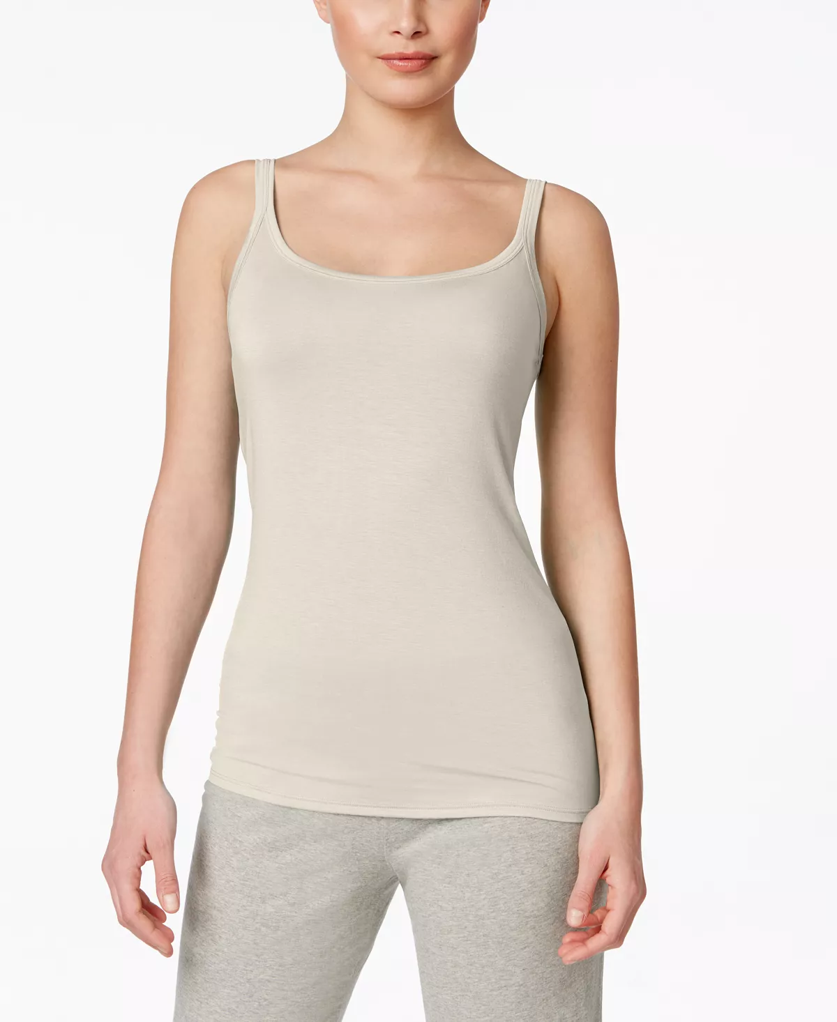 This cami features soft, lightweight fabric. Semi-relaxed styling and a scoop neck make it great for layering. Style #2074