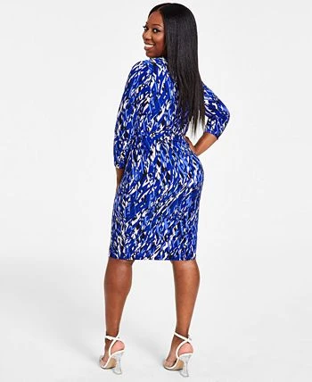 Vivid abstract printed knit puts a contemporary accent on the faux-wrap styling of this versatile desk-to-dinner dress from Kasper.
